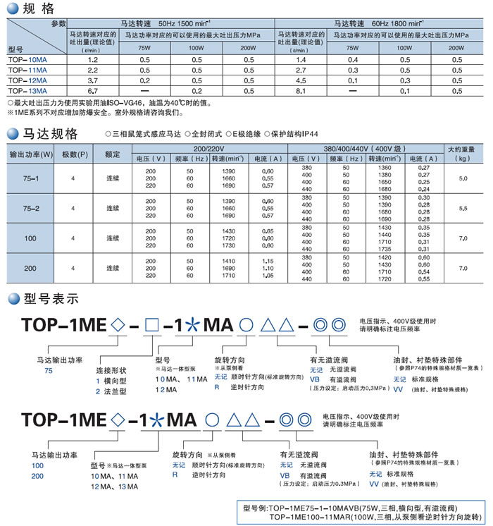 1ME(馬達一體型),馬達輸出功率75W/100W/200W。小型、輕量,小流量(0.8~4.5cm3/rev),低吐出壓。用途:輸送操作油、潤滑油,液體溫度:-5~80°C,適用的液體粘度:10~500mm2/sec。